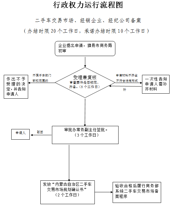 3、盟商务局审批办受理后,经岗位责任人、分管局长核准同意备案的,向旗县市商务部门、企业发放“内蒙古自治区二手车交易市场备案确认书”或“内蒙古自治区二手车交易经营主体确认书”;经审核不符合备案要求的,岗位责任人将申请材料退回旗县市商务主管部门,由旗县市商务主管部门将材料退回申请人。